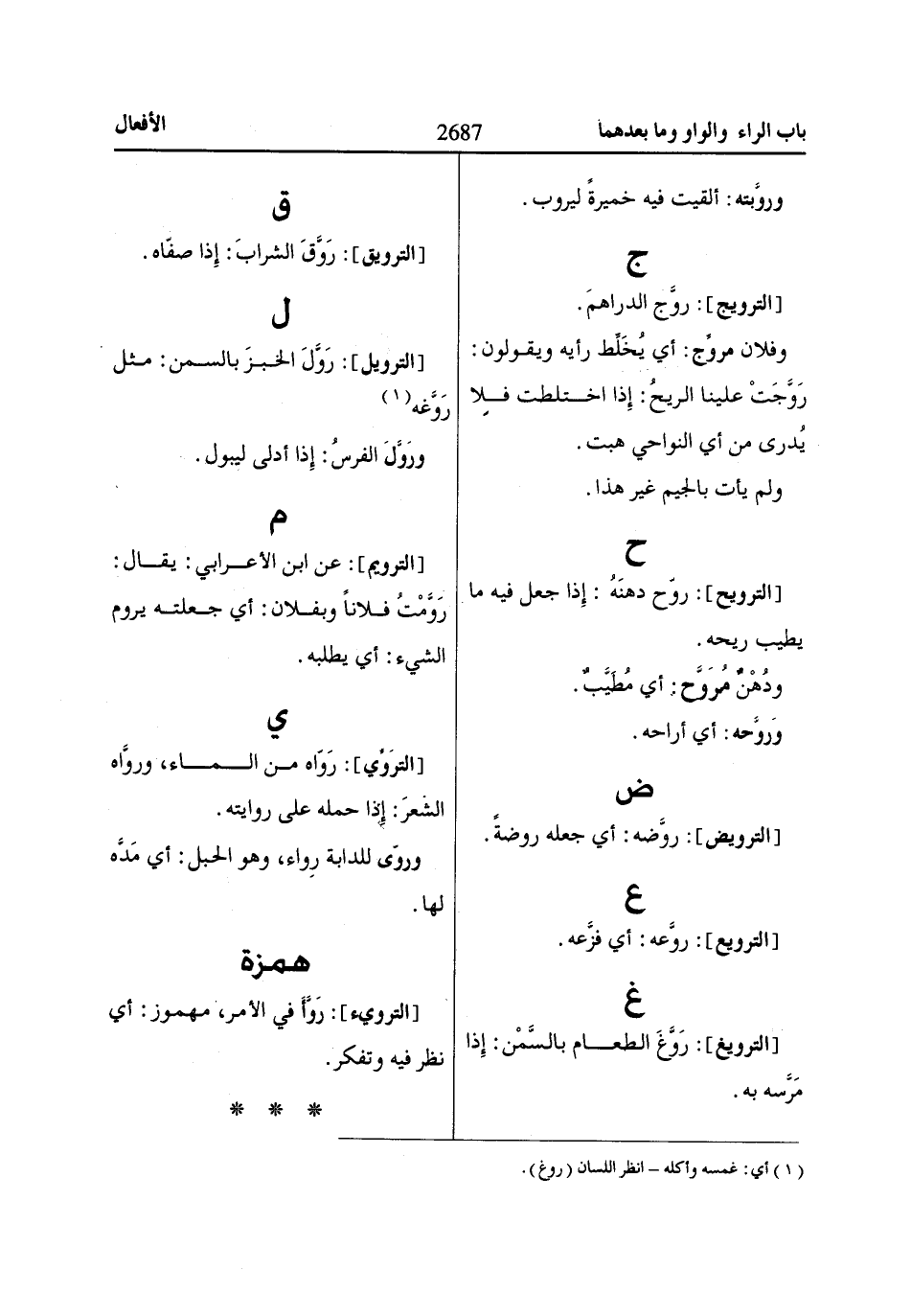 [الترويء]: رَوَّأَ في الأمر، مهموز: أي نظر فيه وتفكر.