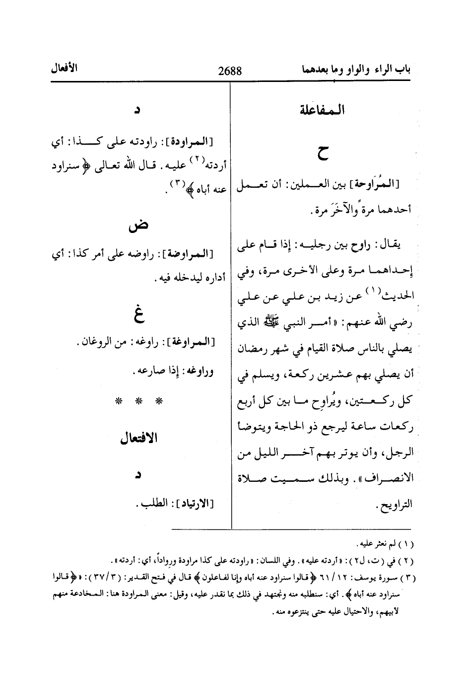 (3) سورة يوسف: 12/ 61 قاالُوا سَنُرااوِدُ عَنْهُ أَبااهُ وَإِنّاا لَفااعِلُونَ قال في فتح القدير: (3/ 37): «قاالُوا سَنُرااوِدُ عَنْهُ أَبااهُ. أي: سنطلبه منه ونجتهد في ذلك بما نقدر عليه، وقيل: معنى المراودة هنا: المخادعة منهم لأبيهم، والاحتيال عليه حتى ينتزعوه منه.
