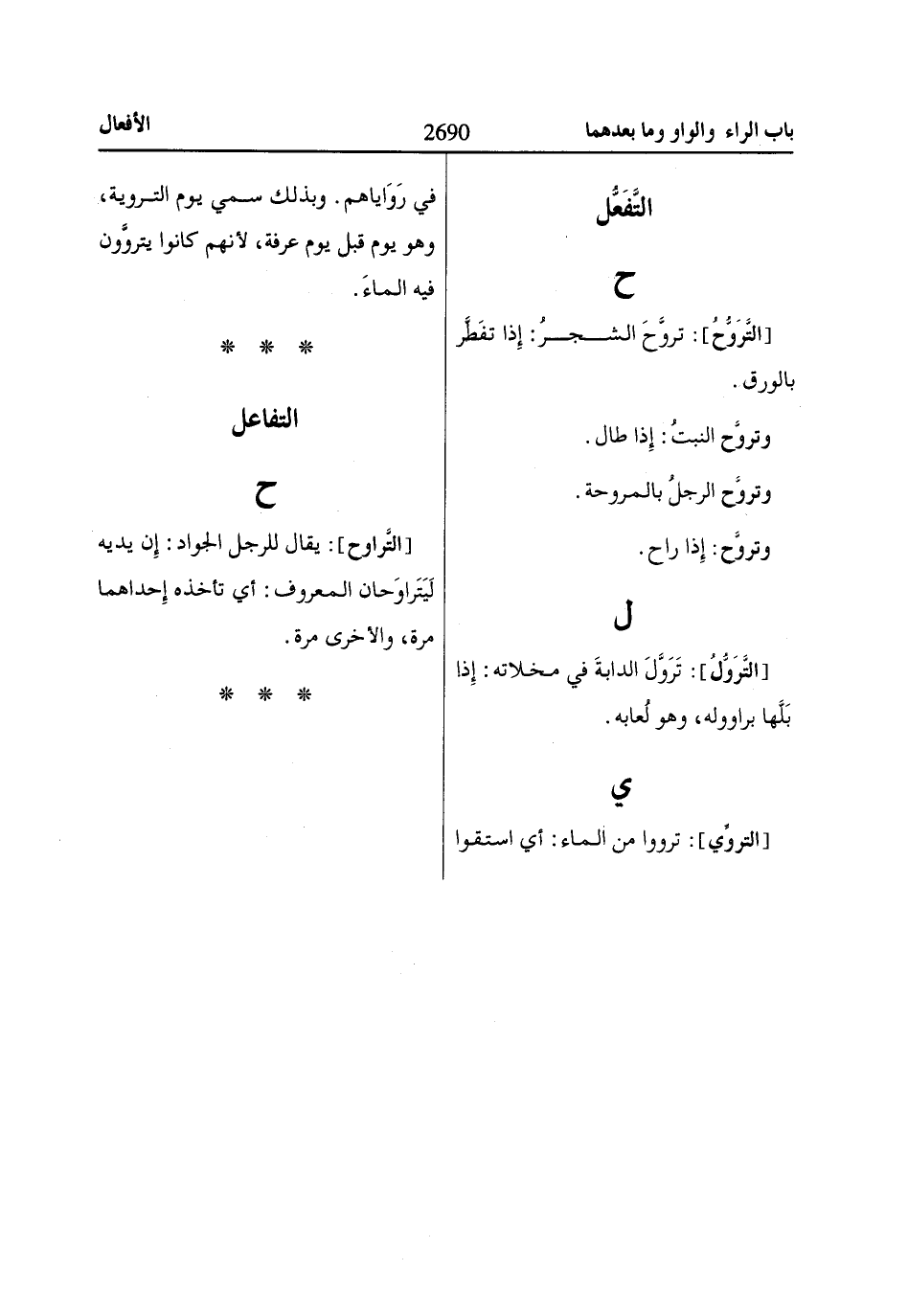 [التروِّي]: ترووا من الماء: أي استقوا في رَوَاياهم. وبذلك سمي يوم التروية، وهو يوم قبل يوم عرفة، لأنهم كانوا يتروَّون فيه الماءَ.