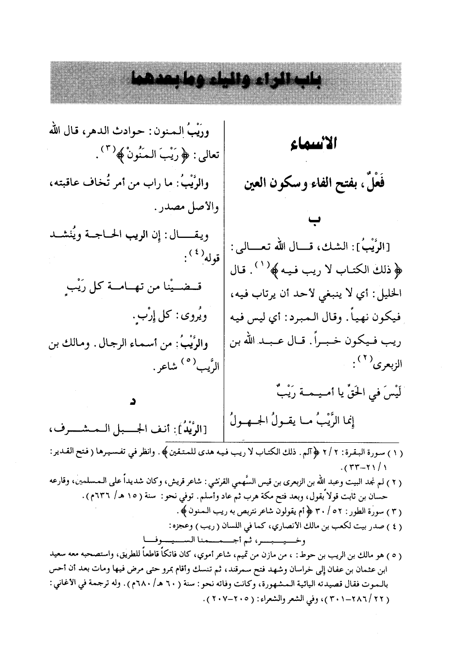ذالِكَ الْكِتاابُ لاا رَيْبَ فِيهِ «1». قال الخليل: أي لا ينبغي لأحد أن يرتاب فيه، فيكون نهياً. وقال المبرد: أي ليس فيه ريب فيكون خبراً. قال عبد الله بن الزبعرى «2»: