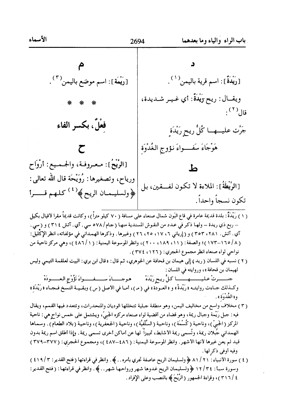 (1) رَيْدَةٌ: بلدة قديمة عامرة في قاع البَون شمال صنعاء على مسافة (70 كيلو متراً)، وكانت قديماً مقرا لأقيال بكيل- ربع ذي ريدة- ولها ذكر في عدد من النقوش المسندية منها (جام/ 578 سي. آي. آتش 314) و (سي.