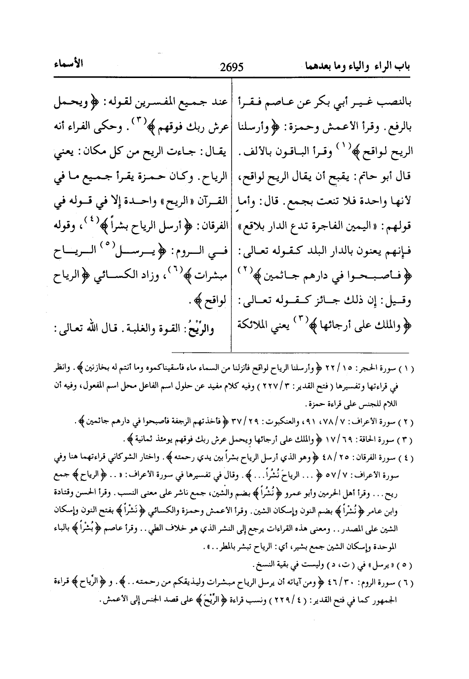 (6) سورة الروم: 30/ 46 وَمِنْ آيااتِهِ أَنْ يُرْسِلَ الرِّيااحَ مُبَشِّرااتٍ وَلِيُذِيقَكُمْ مِنْ رَحْمَتِهِ ... والرِّيااحَ قراءة الجمهور كما في فتح القدير: (4/ 229) ونسب قراءة الريح على قصد الجنس إلى الأعمش.