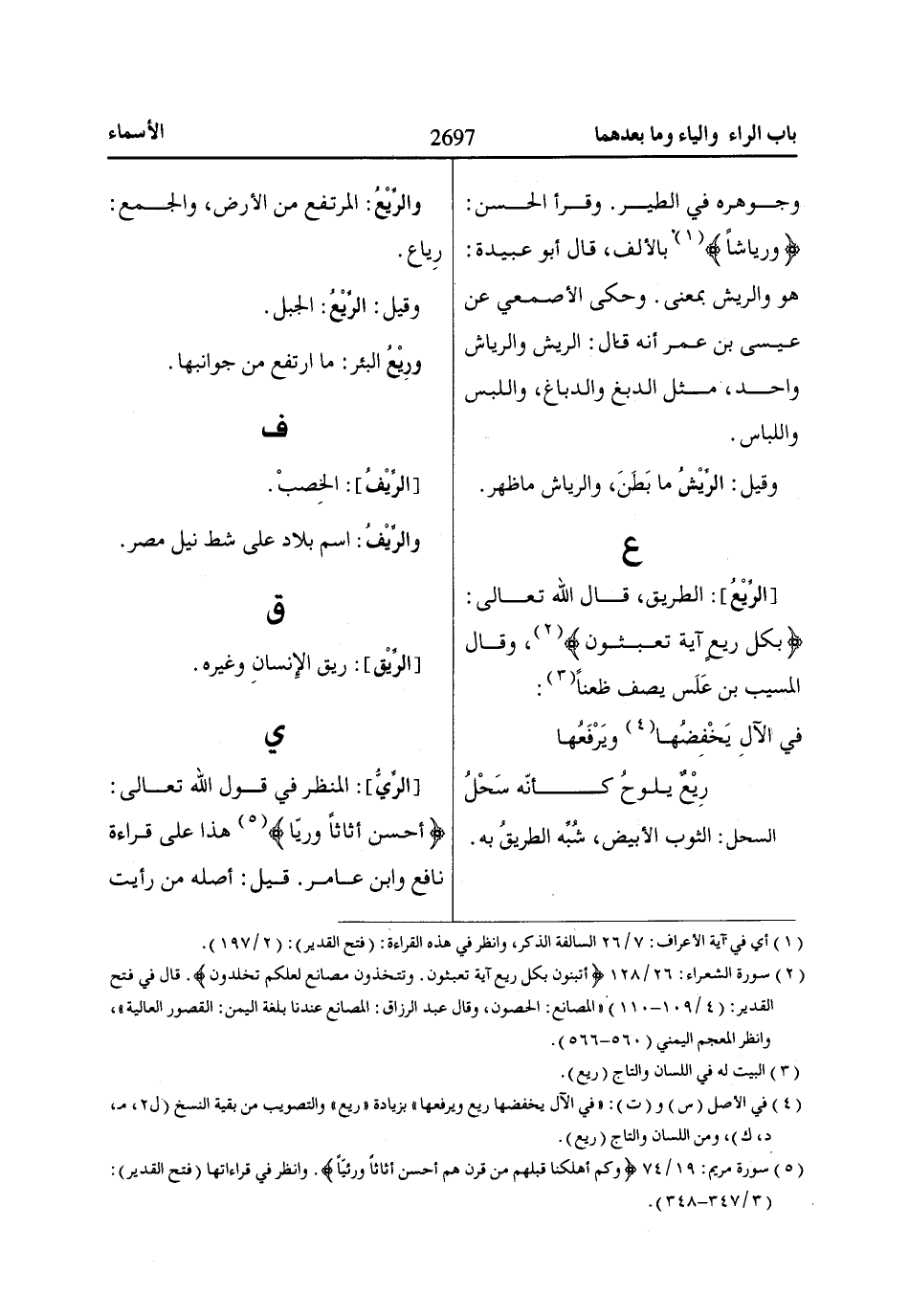 (2) سورة الشعراء: 26/ 128 أَتَبْنُونَ بِكُلِّ رِيعٍ آيَةً تَعْبَثُونَ. وَتَتَّخِذُونَ مَصاانِعَ لَعَلَّكُمْ تَخْلُدُونَ. قال في فتح القدير: (4/ 109 - 110) «المصانع: الحصون، وقال عبد الرزاق: المصانع عندنا بلغة اليمن: القصور العالية»، وانظر المعجم اليمني (560 - 566).
