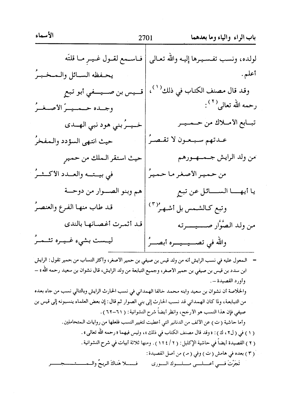 - المعول عليه في نسب الرايش أنه من ولد قيس بن صيفي بن حمير الأصغر، وأكثر النساب من حمير تقول: الرايش ابن سدد بن قيس بن صيفي بن حمير الأصغر، وجميع التبابعة من ولد الرايش، قال نشوان بن سعيد رحمه الله» - وأورد القصيدة-.