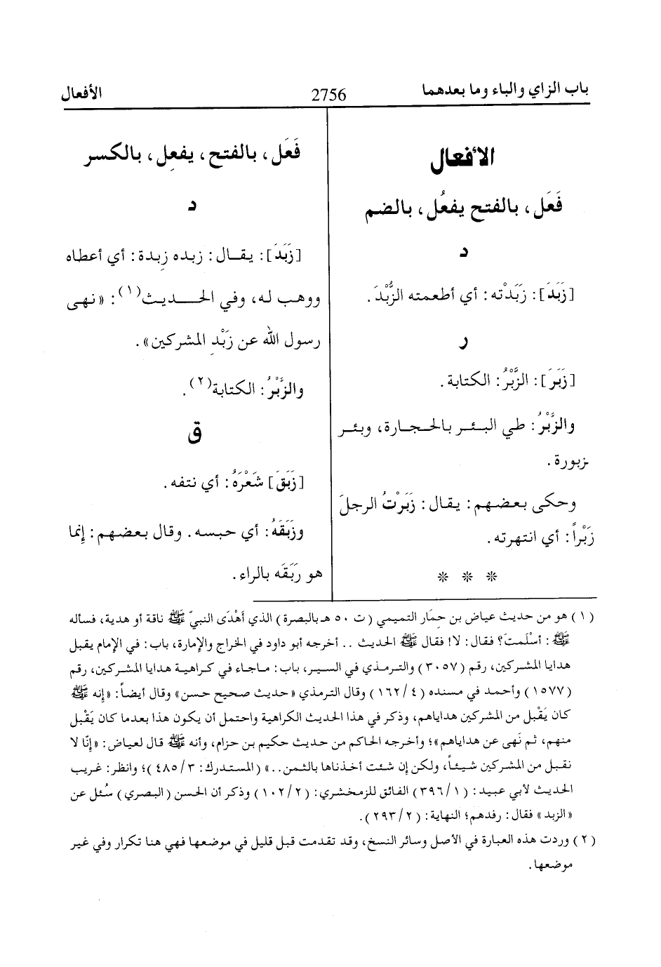 (1) هو من حديث عياض بن حِمَار التميمي (ت 50 هـبالبصرة) الذي أَهْدَى النبيّ صلى الله عليه وسلم ناقة أو هدية، فسأله صلى الله عليه وسلم: أسْلَمتَ؟ فقال: لا! فقال صلى الله عليه وسلم الحديث .. أخرجه أبو داود في الخراج والإِمارة، باب: في الإِمام يقبل هدايا المشركين، رقم (3057) والترمذي في السير، باب: ما جاء في كراهية هدايا المشركين، رقم (1577) وأحمد في مسنده (4/ 162) وقال الترمذي «حديث صحيح حسن» وقال أيضاً: «إِنه صلى الله عليه وسلم كان يَقْبل من المشركين هداياهم، وذكر في هذا الحديث الكراهية واحتمل أن يكون هذا بعد ما كان يَقْبل منهم، ثم نَهى عن هداياهم»؛ وأخرجه الحاكم من حديث حكيم بن حزام، وأنه صلى الله عليه وسلم قال لعياض: «إِنّا لا نقبل من المشركين شيئاً، ولكن إِن شئت أخذناها بالثمن .. » (المستدرك: 3/ 485)؛ وانظر: غريب الحديث لأبي عبيد: (1/ 396) الفائق للزمخشري: (2/ 102) وذكر أن الحسن (البصري) سُئل عن «الزبد» فقال: رفدهم؛ النهاية: (2/ 293).