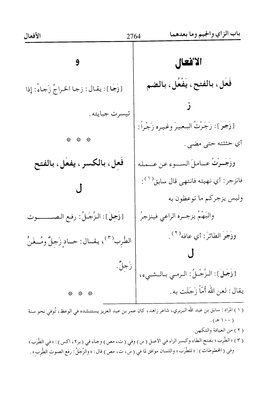 (3) «الطَّرِب» بفتح الطاء وكسر الراء في الأصل (س) وفي (ت، مص) وجاء في (بر 2، اكس): «في الطَّرَب» وفي (المخطوطات): «للطَّرَب» واللسان موافق لما في (س، ت، مص) قال: «والزَّجَلُ: رفع الصوتِ الطَّرِبِ».