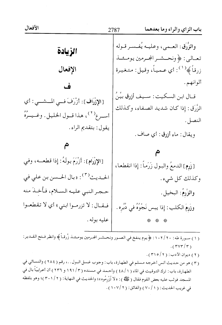 (3) هو من حديث أنس أخرجه مسلم في الطهارة، باب: وجوب غسل البول ... ، رقم (284) والنسائي في الطهارة، باب: ترك التوقيت في الماء (1/ 48) وأحمد في مسنده (3/ 191 و 236) أن أعرابيّاً بال في المسجد فوثب عليه بعض القوم فقال (صلى الله عليه وسلم): «لا تُزْرِمُوه»؛ والحديث في النهاية: (2/ 301)؛ وهو بلفظه في غريب الحديث: (1/ 70) والفائق: (2/ 107).
