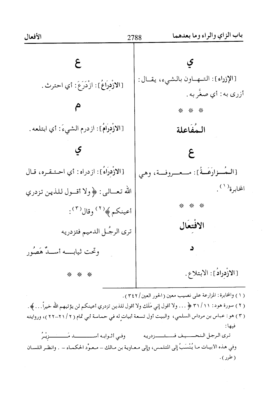 [الازْدِرَاءُ]: ازدراه: أي احتقره، قال الله تعالى: وَلاا أَقُولُ لِلَّذِينَ تَزْدَرِي أَعْيُنُكُمْ «2» وقال «3»: