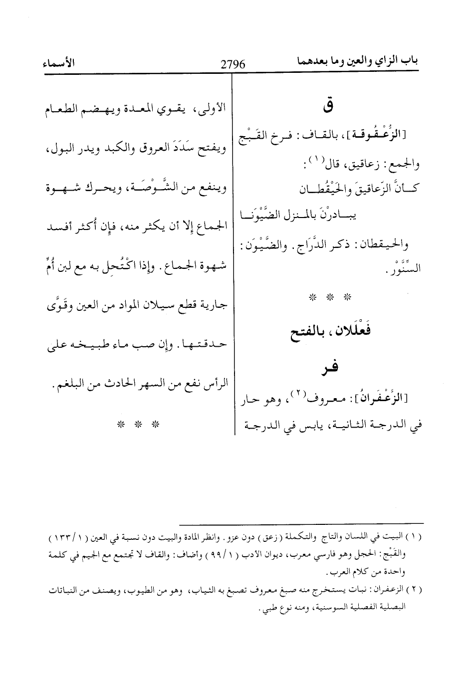[الزَّعْفَرانُ]: معروف «2»، وهو حار في الدرجة الثانية، يابس في الدرجة الأولى، يقوي المعدة ويهضم الطعام ويفتح سَدَدَ العروق والكبد ويدر البول، وينفع من الشَّوْصَة، ويحرك شهوة الجماع إِلا أن يكثر منه، فإِن أُكثر أفسد شهوة الجماع. وإِذا اكْتُحِل به مع لبن أُمِّ جارية قطع سيلان المواد من العين وقَوَّى حدقتها. وإِن صب ماء طبيخه على الرأس نفع من السهر الحادث من البلغم.