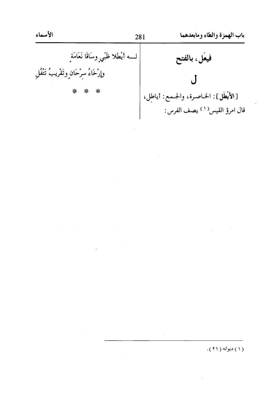 [الأَيْطَل]: الخاصرة، والجمع: أياطِل، قال امرؤ القيس «1» يصف الفرس: