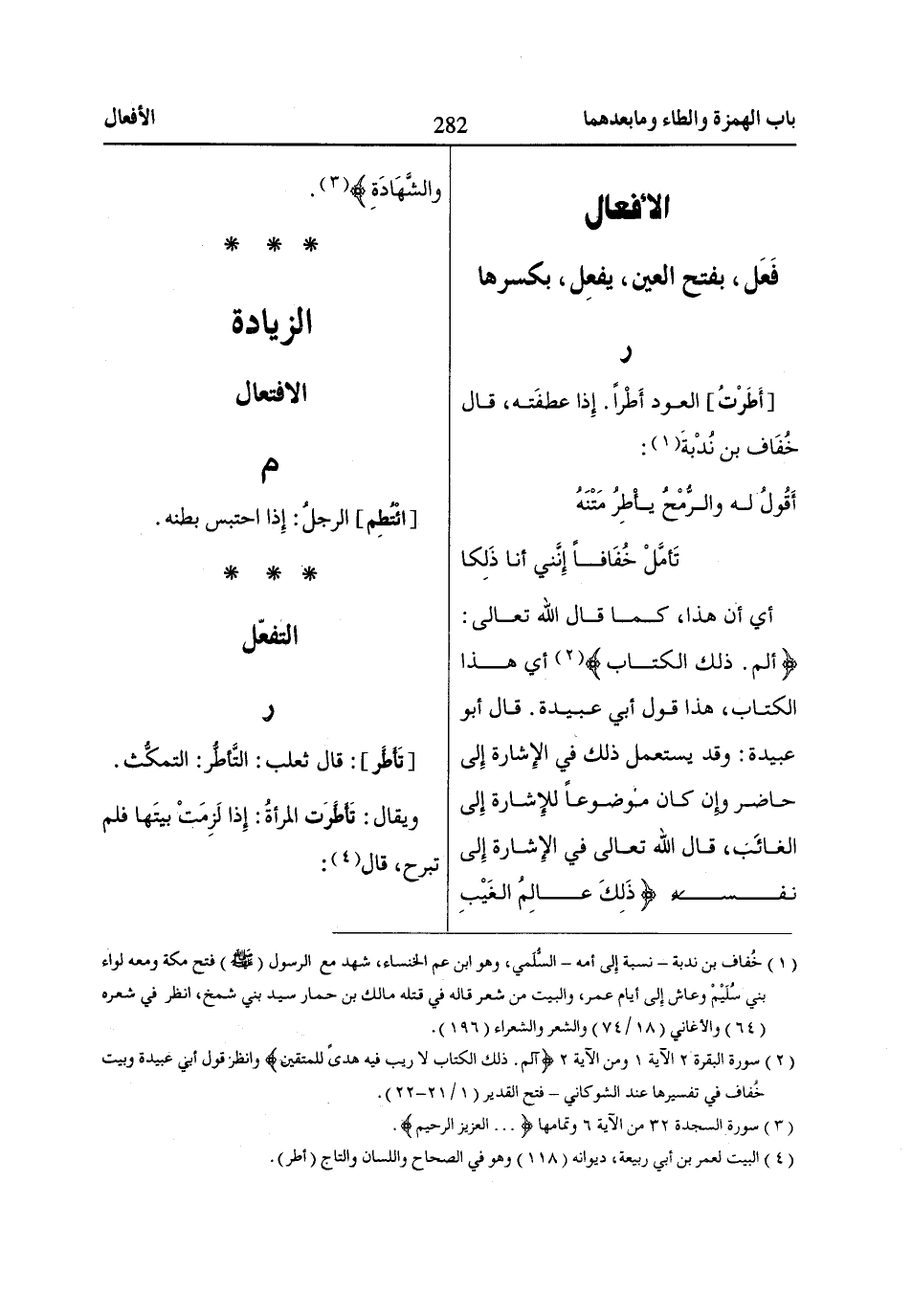 (2) سورة البقرة 2 الآية 1 ومن الآية 2 الم. ذالِكَ الْكِتاابُ لاا رَيْبَ فِيهِ هُدىً لِلْمُتَّقِينَ وانظر قول أبي عبيدة وبيت خُفاف في تفسيرها عند الشوكاني- فتح القدير (1/ 21 - 22).