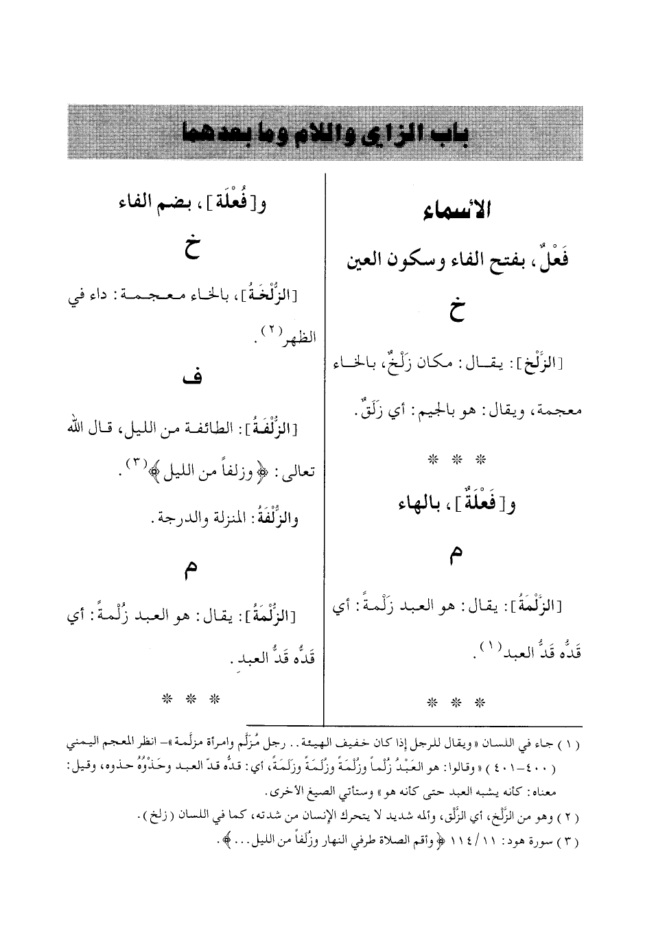 (1) جاء في اللسان «ويقال للرجل إِذا كان خفيف الهيئة .. رجل مُزَلَّم وامرأة مزلَّمة» - انظر المعجم اليمني (400 - 401) «وقالوا: هو العَبْدُ زُلْماً وزُلْمَةً وزَلَمَةً، أي: قدُّه قدّ العبد وحَذْوُهُ حذوه، وقيل: