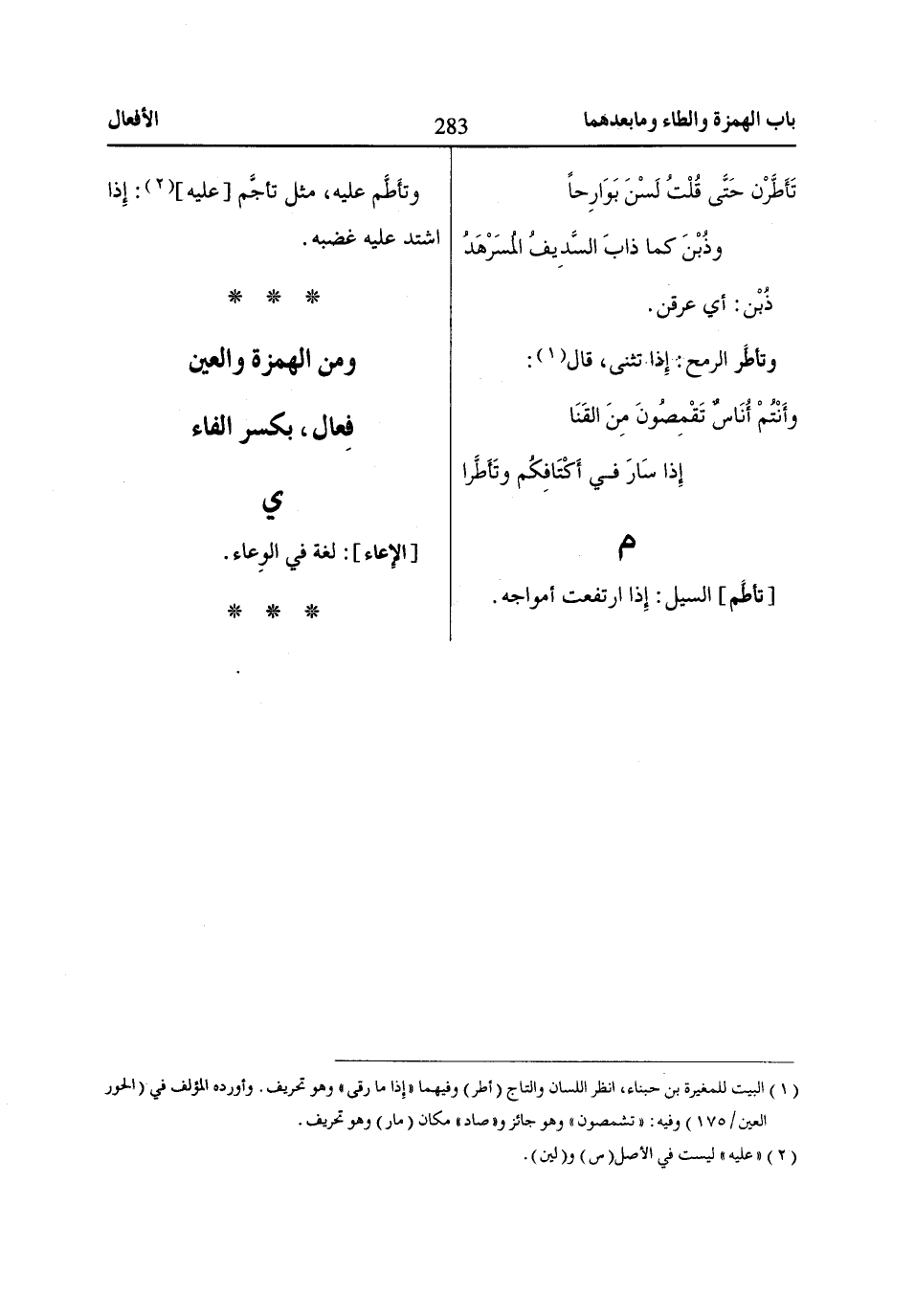 (1) البيت للمغيرة بن حبناء، انظر اللسان والتاج (أطر) وفيهما «إِذا ما رقى» وهو تحريف. وأورده المؤلف في (الحور العين/ 175) وفيه: «تشمصون» وهو جائز و «صاد» مكان (مار) وهو تحريف.