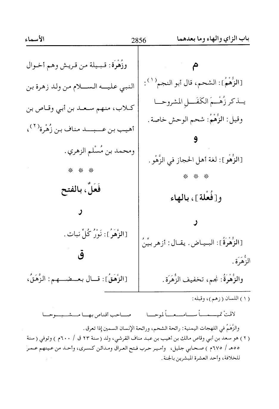 وزُهْرَة: قبيلة من قريش وهم أخوال النبي عليه السلام من ولد زهرة بن كلاب، منهم سعد بن أبي وقاص بن أهيب بن عبد مناف بن زُهْرة «2»، ومحمد بن مُسْلم الزهري.