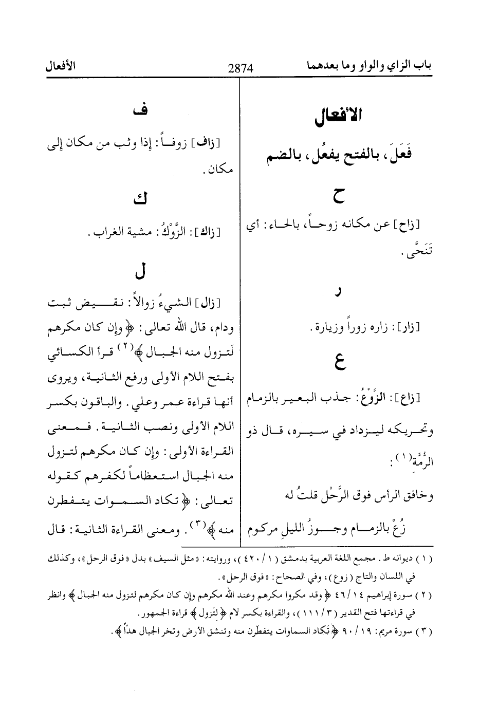 [زال] الشيءُ زوالًا: نقيض ثبت ودام، قال الله تعالى: وَإِنْ كاانَ مَكْرُهُمْ لِتَزُولَ مِنْهُ الْجِباالُ «2» قرأ الكسائي بفتح اللام الأولى ورفع الثانية، ويروى أنها قراءة عمر وعلي. والباقون بكسر اللام الأولى ونصب الثانية. فمعنى القراءة الأولى: وِ إِنْ كَانَ مَكْرُهُمْ لَتَزُولُ مِنْهُ الْجِبَالُ استعظاماً لكفرهم كقوله تعالى: تَكاادُ السَّمااوااتُ يَتَفَطَّرْنَ مِنْهُ «3». ومعنى القراءة الثانية: