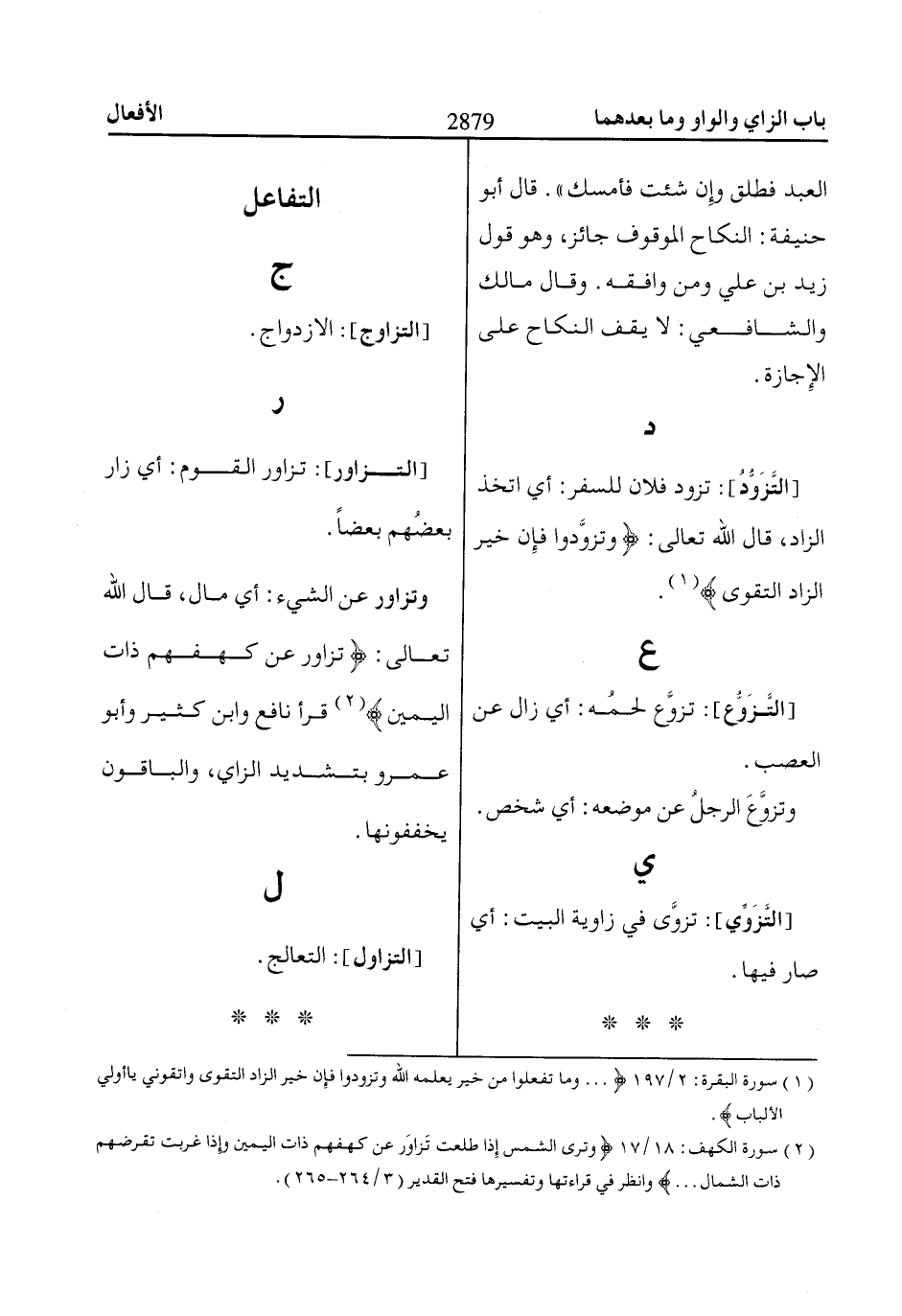 وتزاور عن الشيء: أي مال، قال الله تعالى: تَتَزااوَرُ! عَنْ كَهْفِهِمْ ذااتَ الْيَمِينِ «2» قرأ نافع وابن كثير وأبو عمرو بتشديد الزاي، والباقون يخففونها.