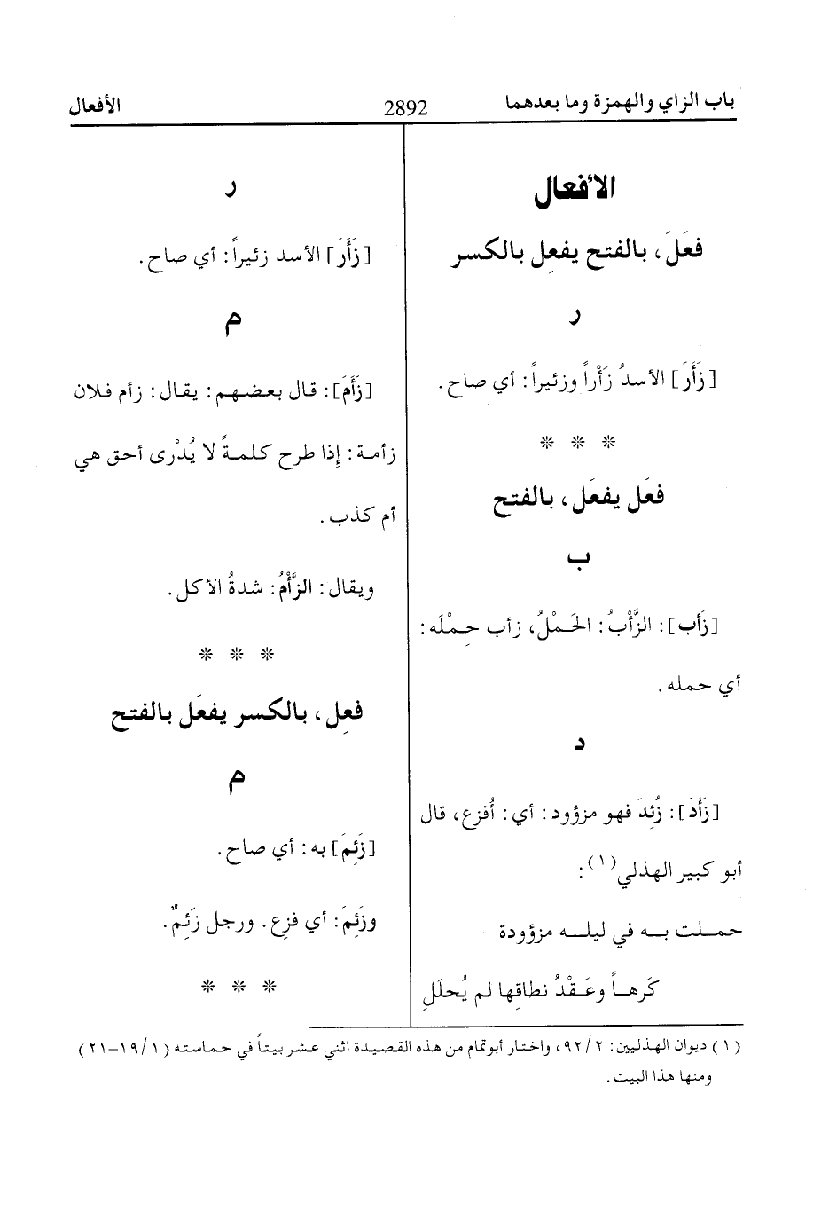 [زَأَدَ]: زُئِدَ فهو مزؤود: أي: أُفزع، قال أبو كبير الهذلي «1»: