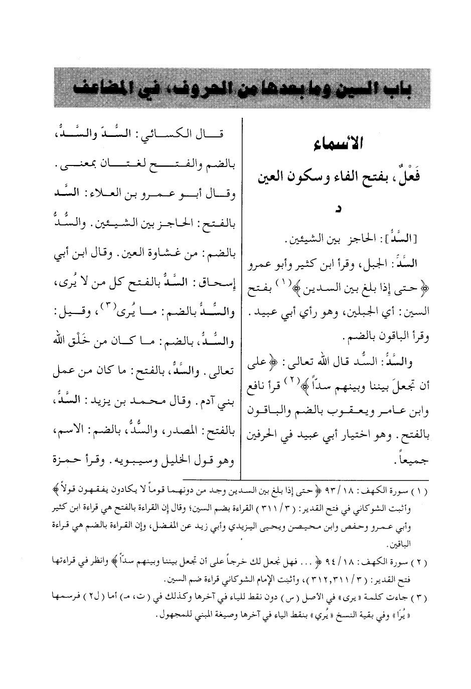 (1) سورة الكهف: 18/ 93 حَتّاى إِذاا بَلَغَ بَيْنَ السَّدَّيْنِ وَجَدَ مِنْ دُونِهِماا قَوْماً لاا يَكاادُونَ يَفْقَهُونَ قَوْلًا وأثبت الشوكاني في فتح القدير: (3/ 311) القراءة بضم السين؛ وقال إِن القراءة بالفتح هي قراءة ابن كثير وأبي عمرو وحفص وابن محيصن ويحيى اليزيدي وأبي زيد عن المفضل، وإِن القراءة بالضم هي قراءة الباقين.