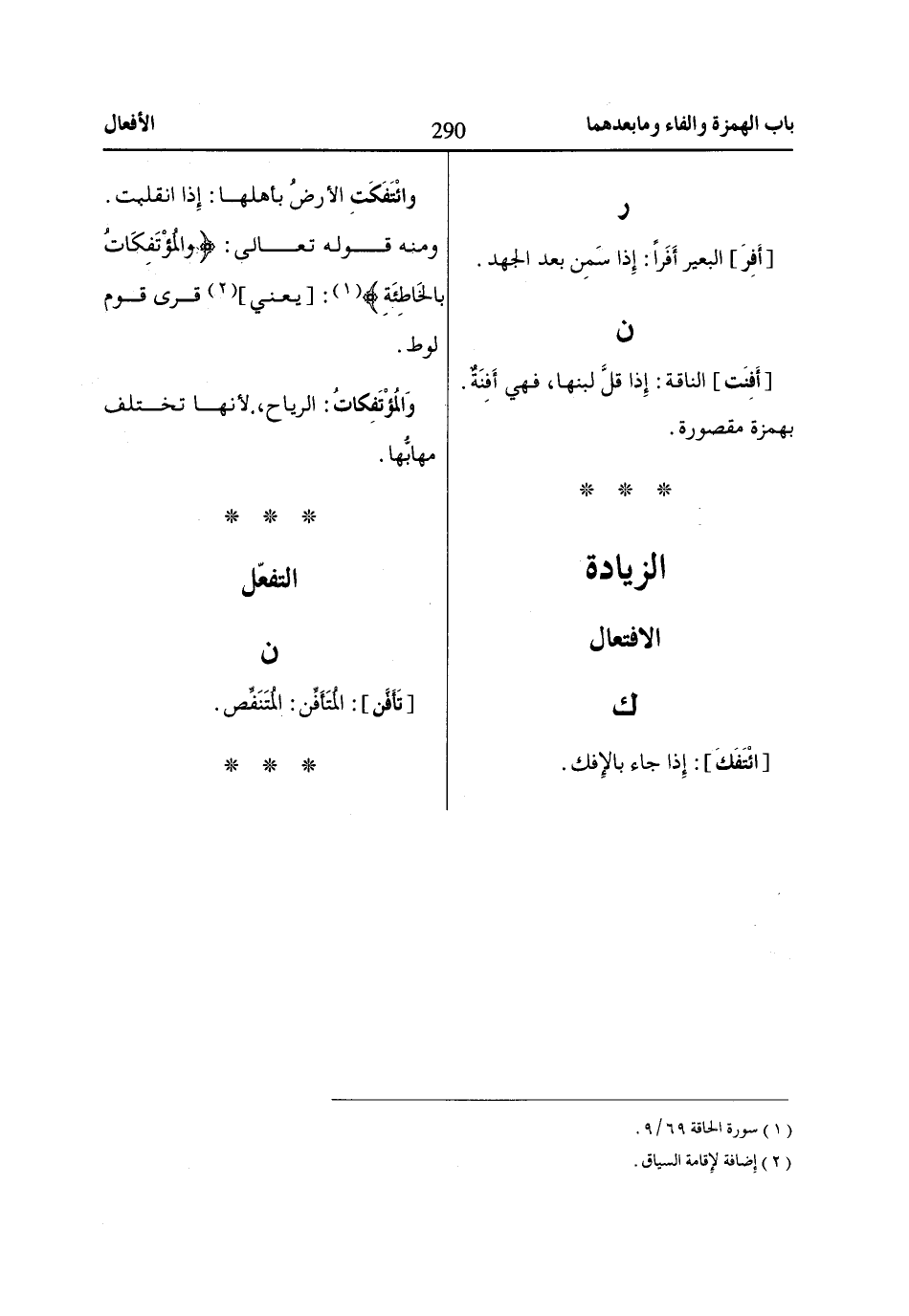 ومنه قوله تعالى: وَالْمُؤْتَفِكااتُ بِالْخااطِئَةِ «1»: [يعني] «2» قرى قوم لوط.