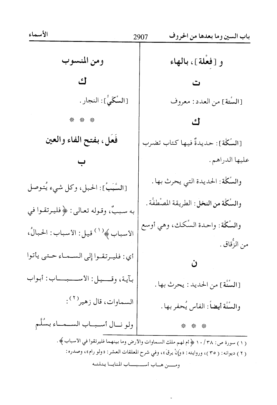 [السَّبَبُ]: الحبل، وكل شيء يُتوصل به سببٌ، وقوله تعالى: فَلْيَرْتَقُوا فِي الْأَسْباابِ «1» قيل: الأسباب: الحبالُ، أي: فليرتقوا إِلى السماء حتى يأتوا بآية، وقيل: الأسباب: أبواب السماوات، قال زهير «2»: