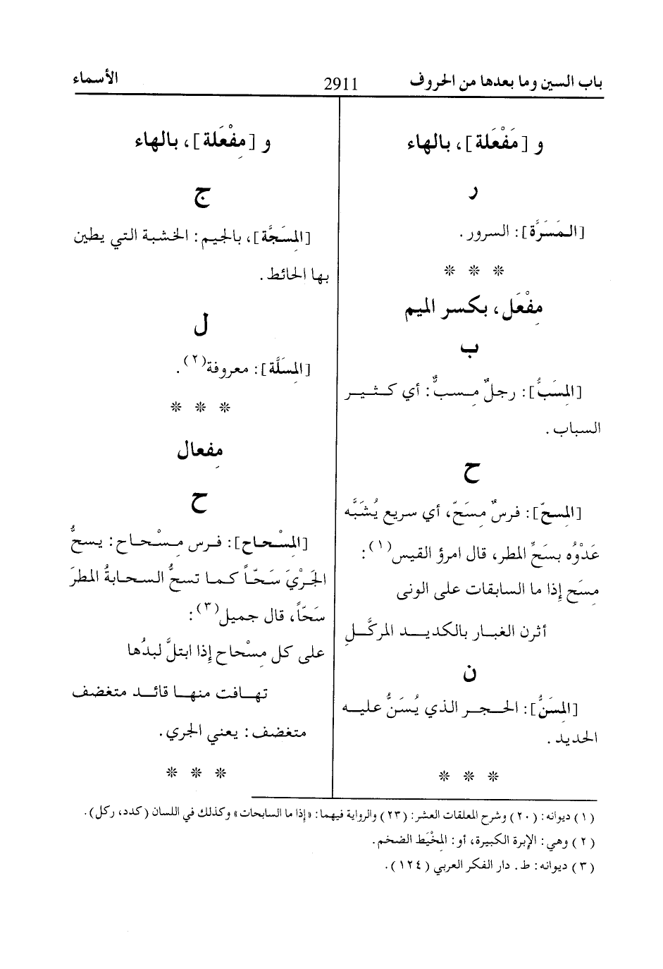 [المِسْحاح]: فرس مِسْحاح: يسحُّ الجَرْيَ سَحّاً كما تسحُّ السحابةُ المطرَ سَحّاً، قال جميل «3»:
