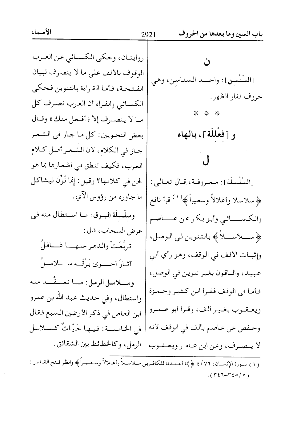 سَلااسِلَ وَأَغْلاالًا وَسَعِيراً «1» قرأ نافع والكسائي وأبو بكر عن عاصم سَلَاسَلًا بالتنوين في الوصل، وإِثبات الألف في الوقف، وهو رأي أبي عبيد، والباقون بغير تنوين في الوصل، فأما في الوقف فقرأ ابن كثير وحمزة ويعقوب بغير ألف، وقرأ أبو عمرو وحفص عن عاصم بألف في الوقف لأنه لا ينصرف، وعن ابن عامر ويعقوب روايتان، وحكى الكسائي عن العرب الوقوف بالألف على ما لا ينصرف لبيان الفتحة، فأما القراءة بالتنوين فحكى الكسائي والفراء أن العرب تصرف كل ما لا ينصرف إِلا «أفعل منك» وقال بعض النحويين: كل ما جاز في الشعر جاز في الكلام، لأن الشعر أصل كلام العرب، فكيف تنطق في أشعارها بما هو لحن في كلامها؟ وقيل: إِنما نُوِّن ليشاكل ما جاوره من رؤوس الآي.