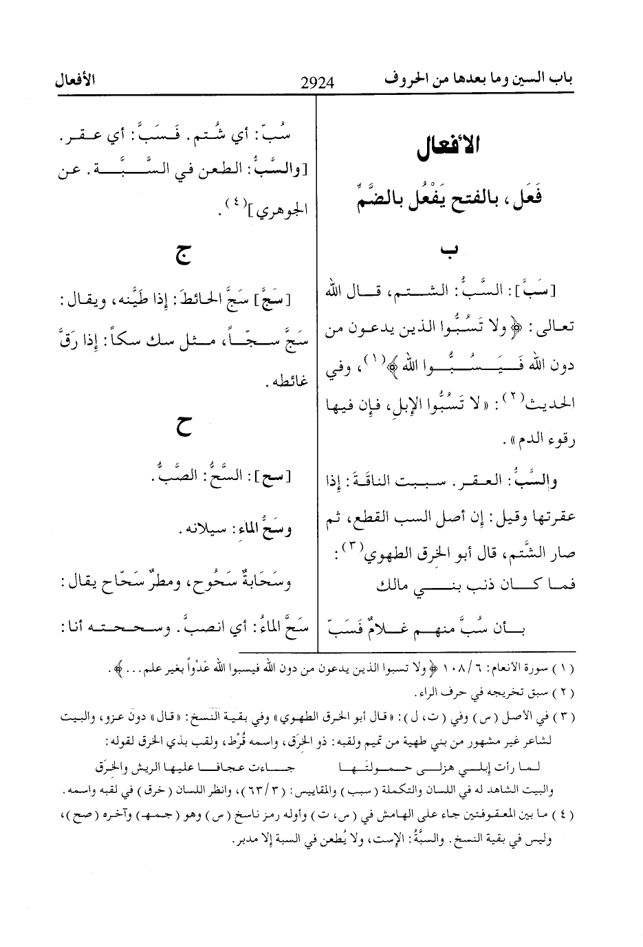 [سَبَّ]: السَّبُّ: الشتم، قال الله تعالى: وَلاا تَسُبُّوا الَّذِينَ يَدْعُونَ مِنْ دُونِ اللّاهِ فَيَسُبُّوا اللّاهَ «1»،