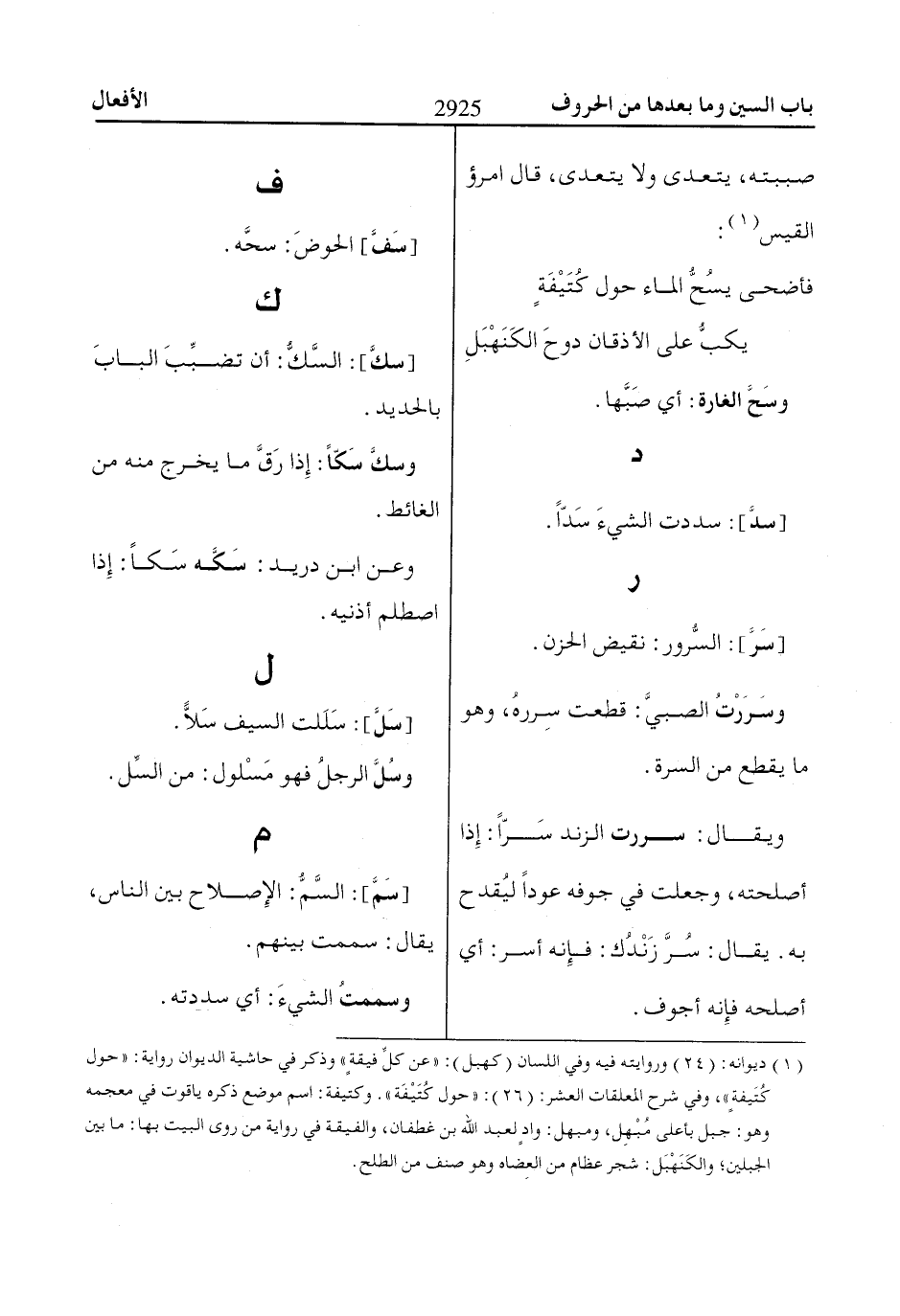 وكتيفة: اسم موضع ذكره ياقوت في معجمه وهو: جبل بأعلى مُبْهِل، ومبهل: وادٍ لعبد الله بن غطفان، والفيقة في رواية من روى البيت بها: ما بين الجبلين؛ والكَنَهْبَل: شجر عظام من العِضاه وهو صنف من الطلح.