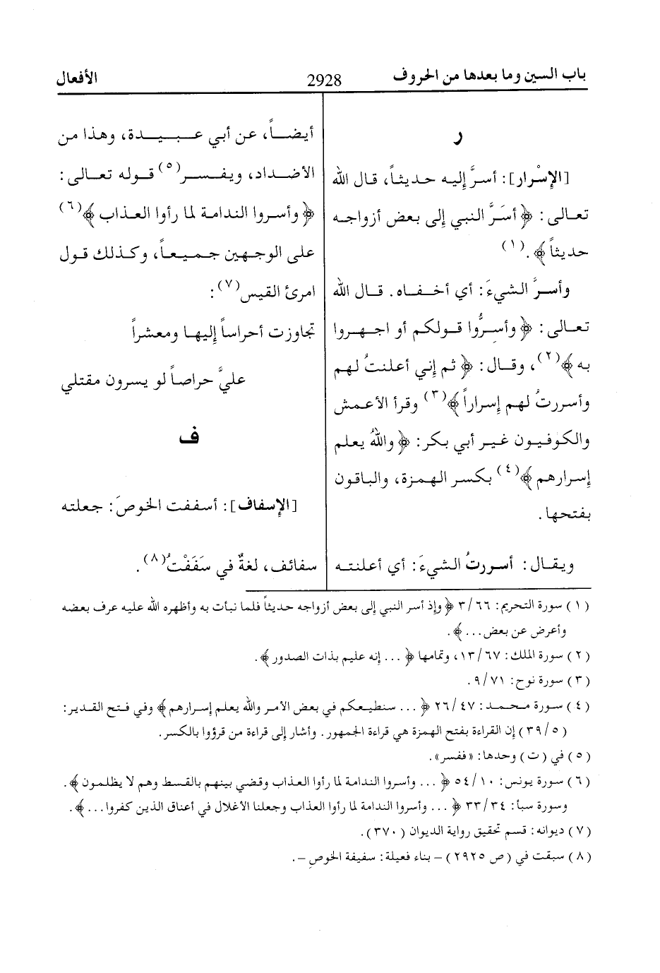 [الإِسْرار]: أسرَّ إِليه حديثاً، قال الله تعالى: أَسَرَّ النَّبِيُّ إِلى بَعْضِ أَزْوااجِهِ حَدِيثاً. «1»
