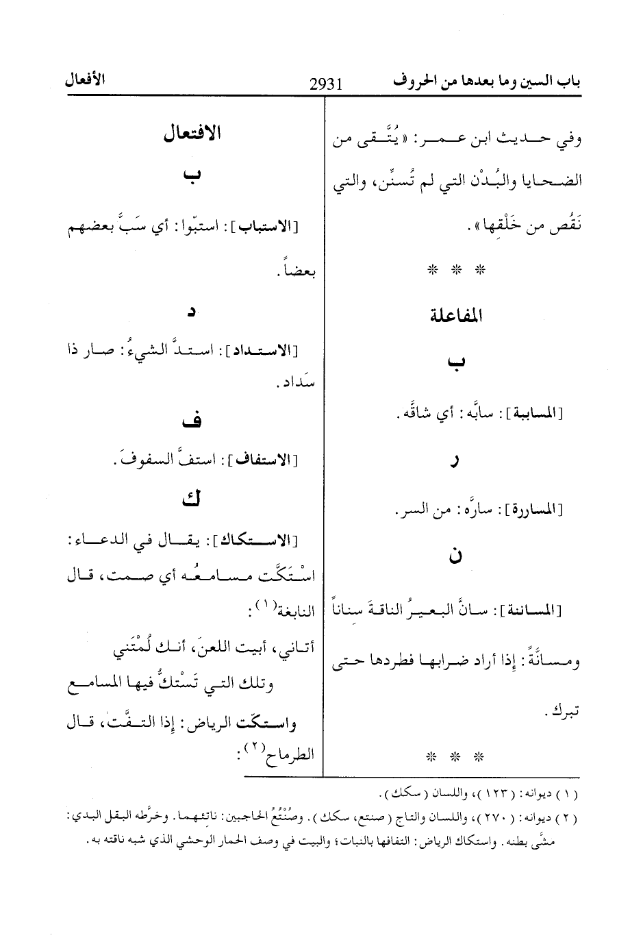 [المساننة]: سانَّ البعيرُ الناقةَ سِناناً ومسانَّةً: إِذا أراد ضرابها فطردها حتى تبرك.