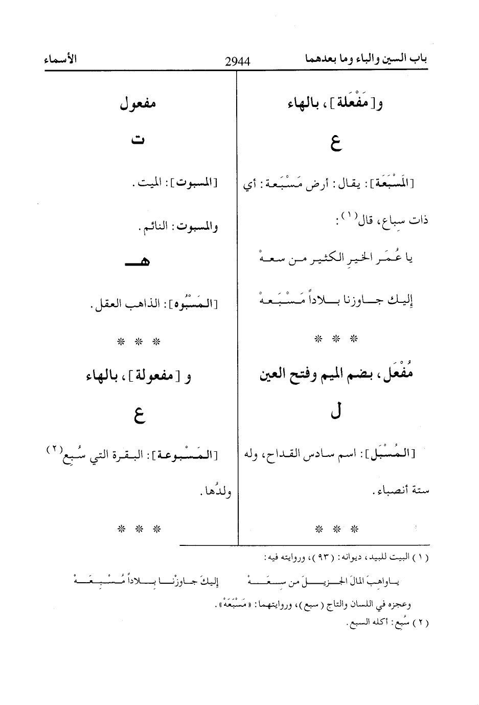 [المَسْبَعَة]: يقال: أرض مَسْبَعة: أي ذات سِباع، قال «1»: