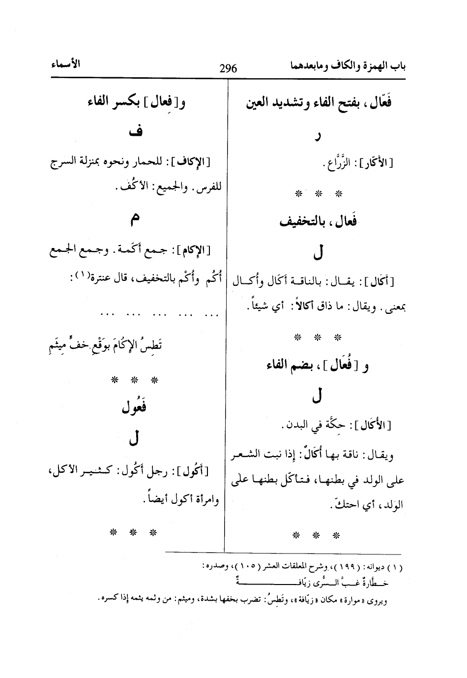 [الإِكاف]: للحمار ونحوه بمنزلة السرج للفرس. والجميع: الأكُف.