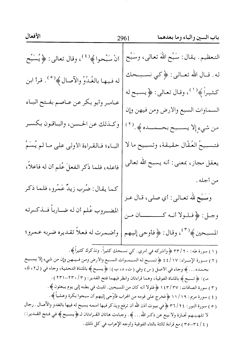 وَسَبَّح للّاه تعالى: أي صلى، قال عز وجل: فَلَوْ لاا أَنَّهُ كاانَ مِنَ الْمُسَبِّحِينَ «3»، وقال: فَأَوْحى إِلَيْهِمْ أَنْ سَبِّحُوا «4»، وقال تعالى: يُسَبِّحُ لَهُ فِيهاا بِالْغُدُوِّ وَالْآصاالِ «5». قرأ ابن عامر وأبو بكر عن عاصم بفتح الباء وكذلك عن الحسن، والباقون بكسر الباء؛ فالقراءة الأولى على ما لم يُسَمَّ فاعله، فلما ذَكر الفعلَ عُلم أن له فاعلًا، كما يقال: ضُرب زيدٌ عَمْرو، فلما ذكر المضروب عُلم أن له ضارباً فذكرته وأضمرت له فعلًا تقديره ضربه عمرو؛