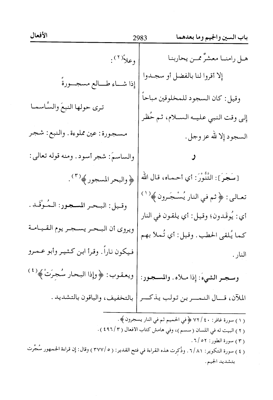 [سَجَرَ]: التَّنُّوْرَ: أي أحماه، قال الله تعالى: ثُمَّ فِي النّاارِ يُسْجَرُونَ «1» أي: يُوقَدون؛ وقيل: أي يلقون في النار كما يُلقى الحطب. وقيل: أي تُملأ بهم النار.