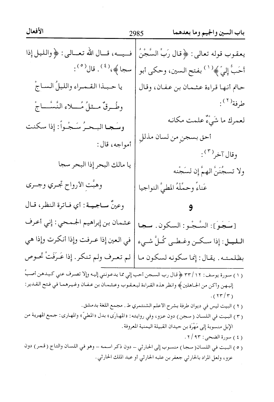 (5) البيت في اللسان (سجا) منسوب إِلى الحارثي- دون ذكر اسمه- وهو في اللسان والتاج (قمر) دون عزو، ولعل المراد بالحارثي جعفر بن علبه الحارثي أو عبد الملك الحارثي.