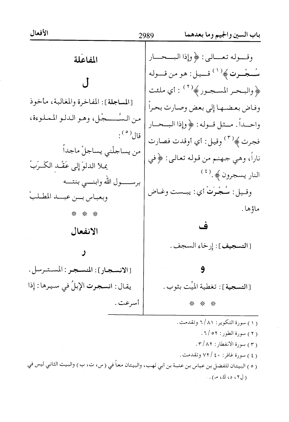 وقوله تعالى: وَإِذَا الْبِحاارُ سُجِّرَتْ «1» قيل: هو من قوله وَالْبَحْرِ الْمَسْجُورِ «2»: أي ملئت وفاض بعضها إِلى بعض وصارت بحراً واحداً. مثل قوله: وَإِذَا الْبِحاارُ فُجِّرَتْ «3» وقيل: أي أوقدت فصارت ناراً، وهي جهنم من قوله تعالى: فِي النّاارِ يُسْجَرُونَ. «4»