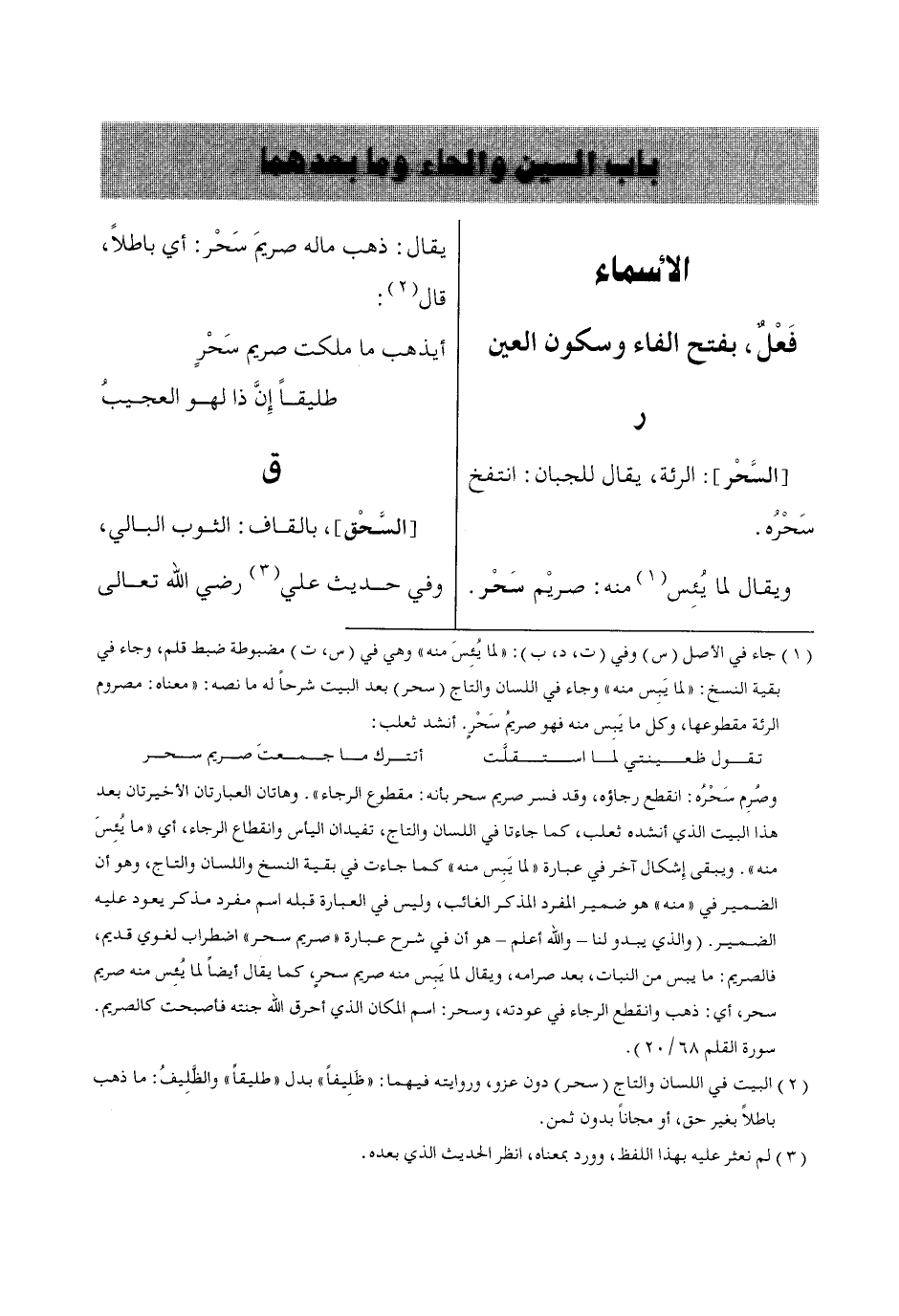 وصُرِم سَحْرُه: انقطع رجاؤه، وقد فسر صريم سحر بأنه: مقطوع الرجاء». وهاتان العبارتان الأخيرتان بعد هذا البيت الذي أنشده ثعلب، كما جاءتا في اللسان والتاج، تفيدان اليأس وانقطاع الرجاء، أي «ما يُئِسَ منه». ويبقى إِشكال آخر في عبارة «لما يَبِس منه» كما جاءت في بقية النسخ واللسان والتاج، وهو أن الضمير في «منه» هو ضمير المفرد المذكر الغائب، وليس في العبارة قبله اسم مفرد مذكر يعود عليه الضمير. (والذي يبدو لنا- والله أعلم- هو أن في شرح عبارة «صريم سحر» اضطراب لغوي قديم، فالصريم: ما يبس من النبات، بعد صرامه، ويقال لما يَبِس منه صريم سحرٍ، كما يقال أيضاً لما يُئِس منه صريم سحر، أي: ذهب وانقطع الرجاء في عودته، وسحر: اسم المكان الذي أحرق الله جنته فأصبحت كالصريم.