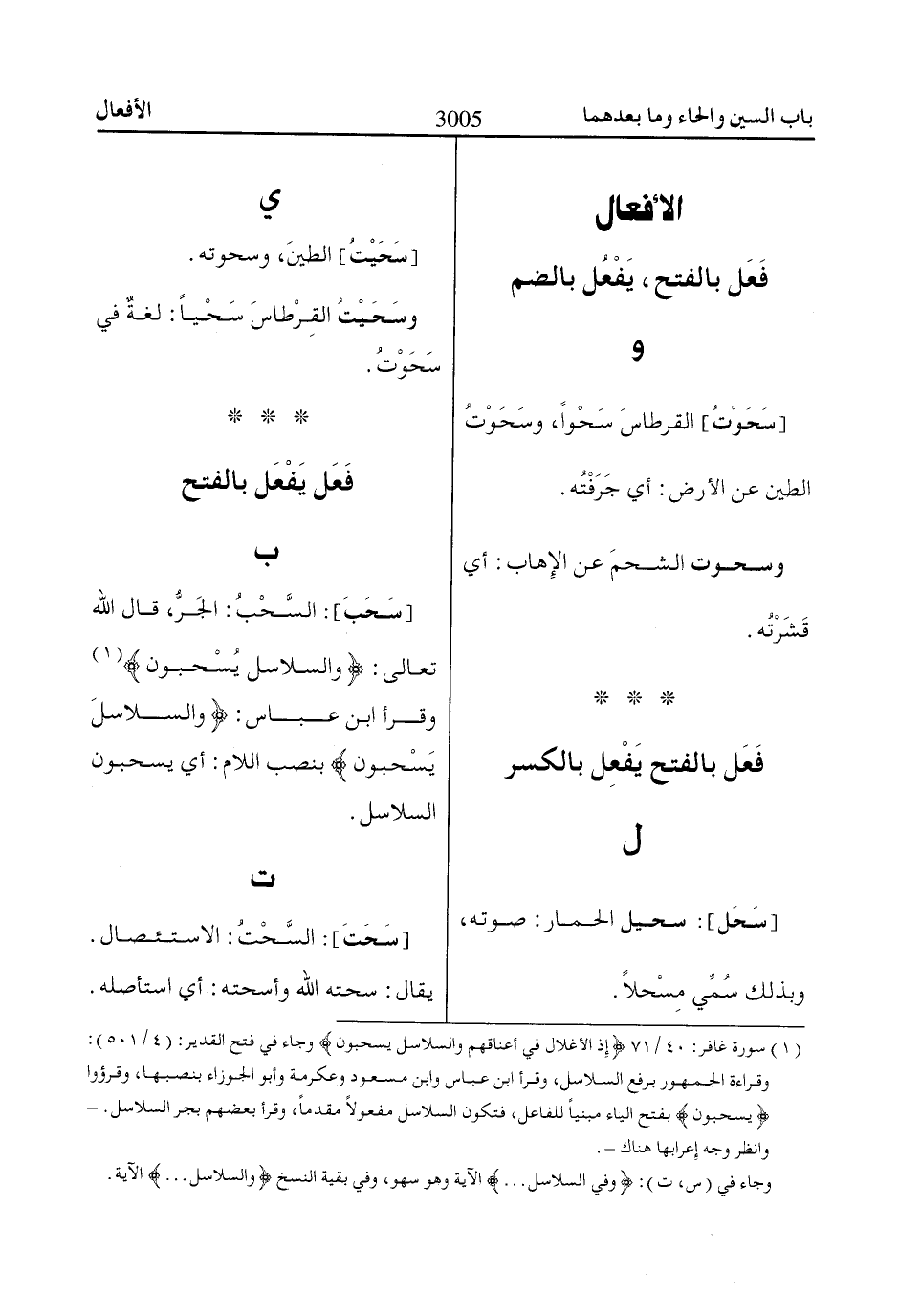 [سَحَبَ]: السَّحْبُ: الجَرُّ، قال الله تعالى: وَالسَّلااسِلُ يُسْحَبُونَ «1» وقرأ ابن عباس: وَالسَّلَاسِلُ يَسْحَبُونَ بنصب اللام: أي يسحبون السلاسل.