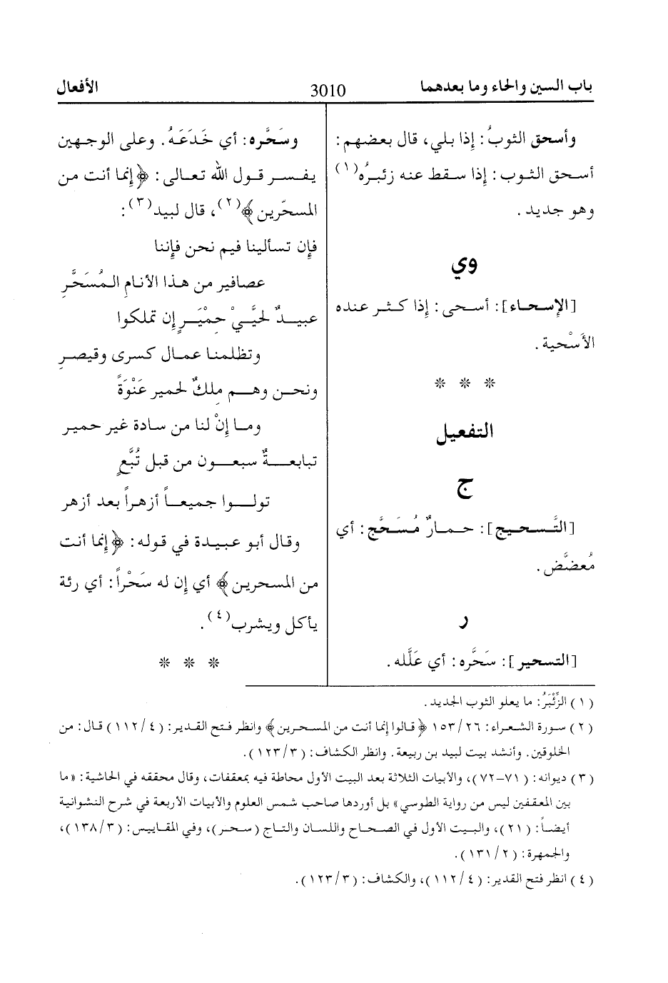 وسَحَّره: أي خَدَعَهُ. وعلى الوجهين يفسر قول الله تعالى: إِنَّماا أَنْتَ مِنَ الْمُسَحَّرِينَ* «2»، قال لبيد «3»: