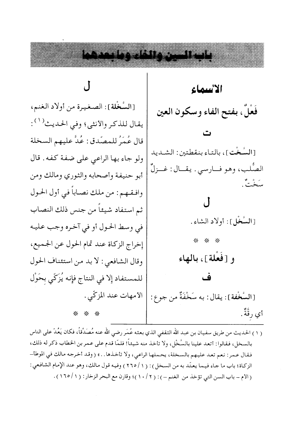 (1) الحديث من طريق سفيان بن عبد الله الثقفي الذي بعثه عُمَر رضي الله عنه مُصَدِّقاً، فكان يَعُدّ على الناس بالسخل، فقالوا: أتعد علينا بالسَّخْل، ولا تأخذ منه شيئاً! فلمّا قدم على عمر بن الخطاب ذكر له ذلك، فقال عمر: نعم تعد عليهم بالسخلة، يحملها الراعي، ولا تأخذها .. » (وقد أخرجه مالك في الموطأ- الزكاة؛ باب ما جاء فيما يعتّد به من السخل): (1/ 265) وفيه قول مالك، وهو عند الإِمام الشافعي:
