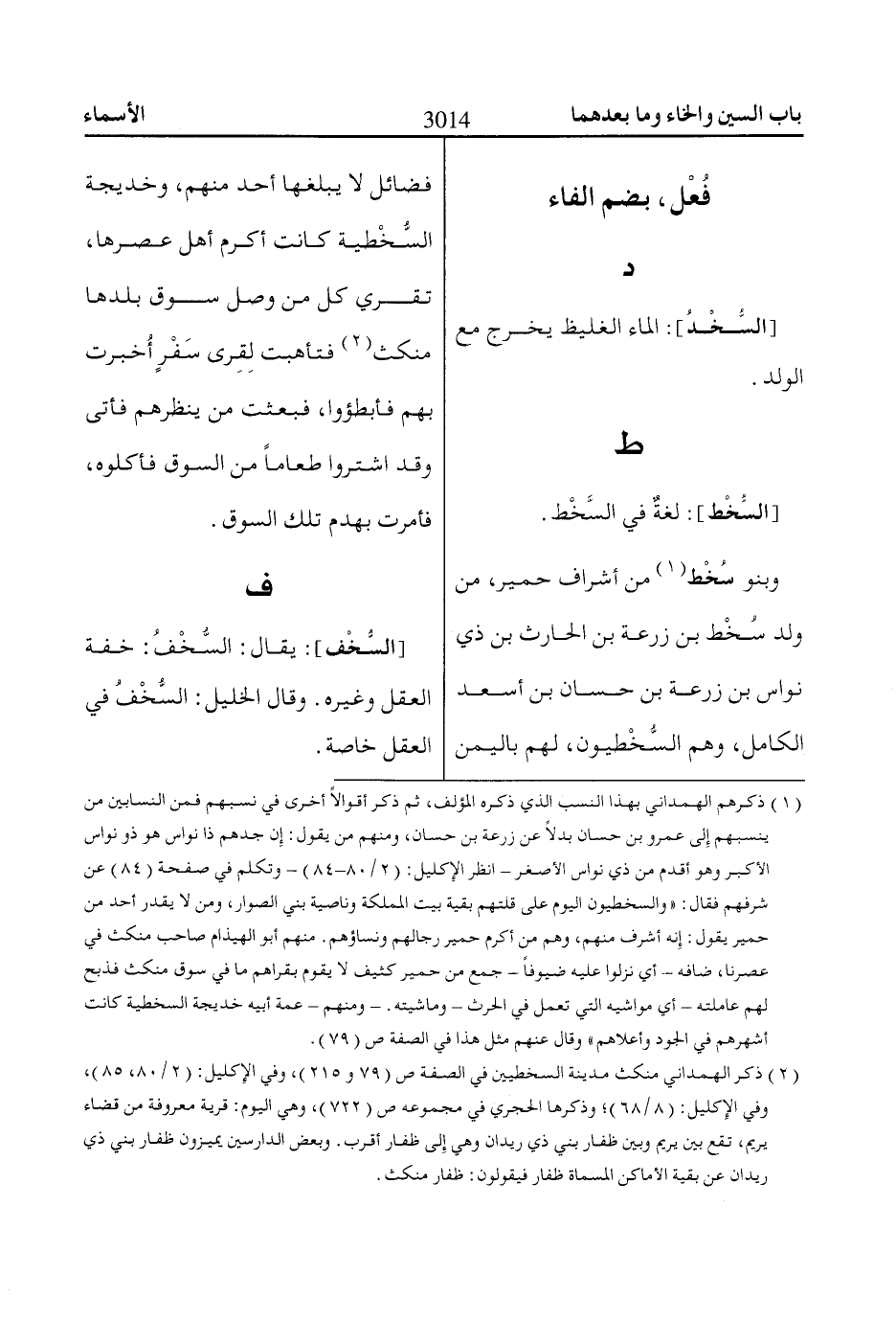 (1) ذكرهم الهمداني بهذا النسب الذي ذكره المؤلف، ثم ذكر أقوالًا أخرى في نسبهم فمن النسابين من ينسبهم إِلى عمرو بن حسان بدلًا عن زرعة بن حسان، ومنهم من يقول: إِن جدهم ذا نواس هو ذو نواس الأكبر وهو أقدم من ذي نواس الأصغر- انظر الإِكليل: (2/ 80 - 84) - وتكلم في صفحة (84) عن شرفهم فقال: «والسخطيون اليوم على قلتهم بقية بيت المملكة وناصية بني الصوار، ومن لا يقدر أحد من حمير يقول: إِنه أشرف منهم، وهم من أكرم حمير رجالهم ونساؤهم. منهم أبو الهيذام صاحب منكث في عصرنا، ضافه- أي نزلوا عليه ضيوفاً- جمع من حمير كثيف لا يقوم بقراهم ما في سوق منكث فذبح لهم عاملته- أي مواشيه التي تعمل في الحرث- وماشيته. - ومنهم- عمة أبيه خديجة السخطية كانت أشهرهم في الجود وأعلاهم» وقال عنهم مثل هذا في الصفة ص (79).