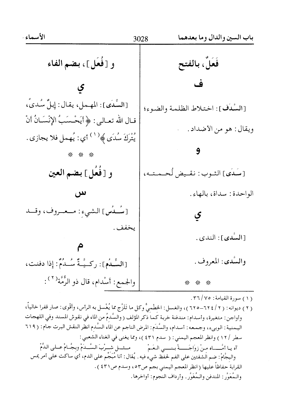 [السُّدُم]: ركيَّةٌ سُدُمٌ: إِذا دفنت، والجمع: أَسْدام، قال ذو الرُّمَّة «2»: