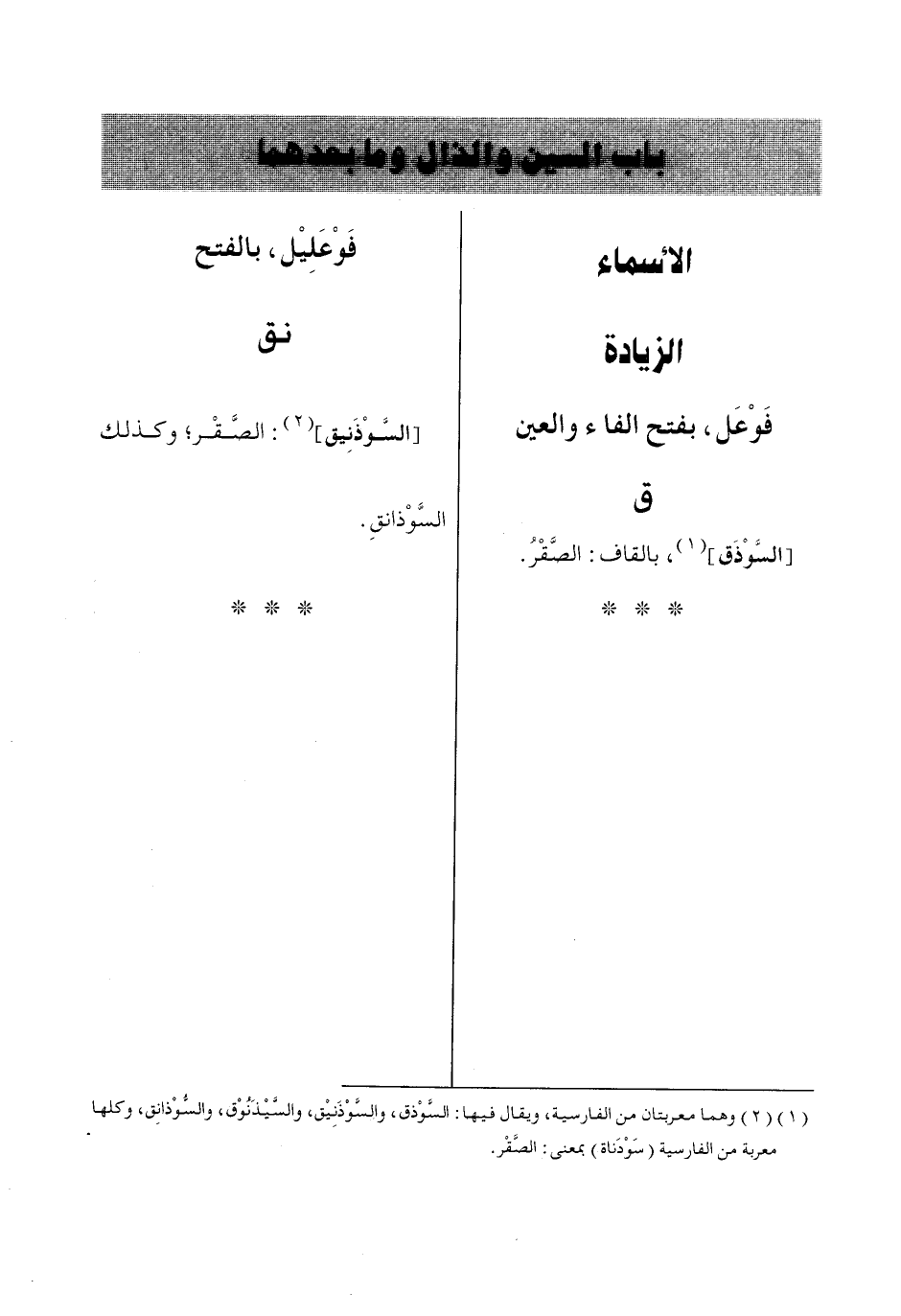 (1) وهما معربتان من الفارسية، ويقال فيها: السَّوْذق، والسَّوْذَنِيْق، والسَّيْذَنُوْق، والسُّوْذانِق، وكلها معربة من الفارسية (سَوْدَناة) بمعنى: الصَّقر.