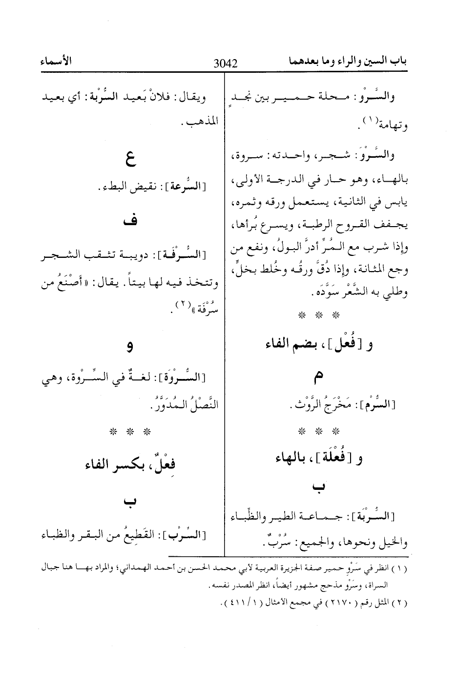 (1) انظر في سَرْوِ حمير صفة الجزيرة العربية لأبي محمد الحسن بن أحمد الهمداني؛ والمراد بها هنا جبال السراة، وسَرْو مذحج مشهور أيضاً، انظر المصدر نفسه.