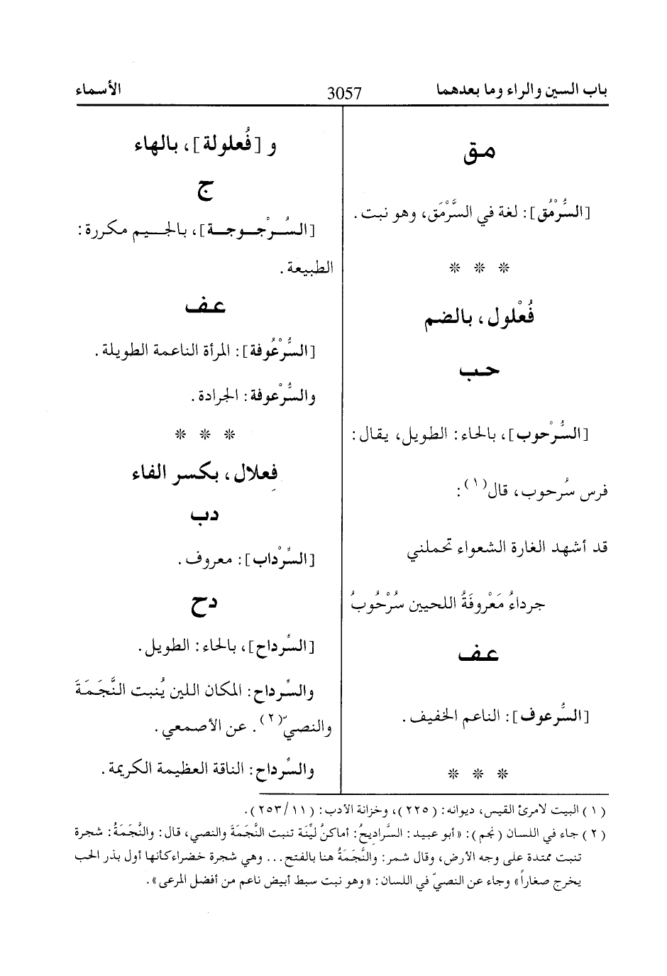 (2) جاء في اللسان (نجم): «أبو عبيد: السَّرادِيحُ: أماكنُ ليِّنَة تنبت النَّجَمَةَ والنصي، قال: والنَّجَمَةُ: شجرة تنبت ممتدة على وجه الأرض، وقال شمر: والنَّجَمَةُ هنا بالفتح ... وهي شجرة خضراء كأنها أول بذر الحب يخرج صغاراً» وجاء عن النصيّ في اللسان: «وهو نبت سبط أبيض ناعم من أفضل المرعى».