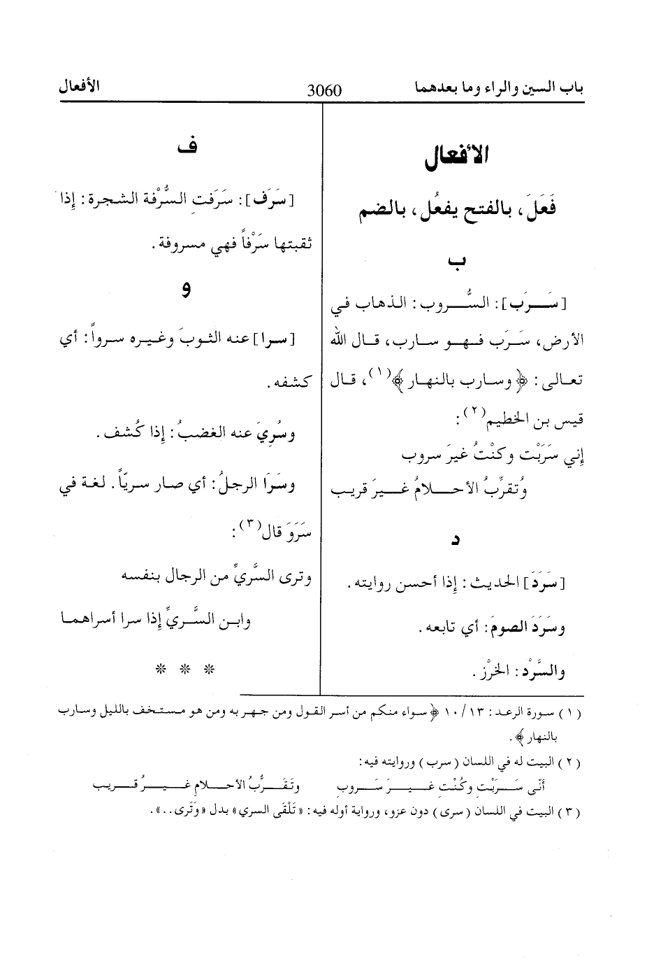 [سَرَب]: السُّروب: الذهاب في الأرض، سَرَب فهو سارب، قال اللّاه تعالى: وَساارِبٌ بِالنَّهاارِ «1»، قال قيس بن الخطيم «2»: