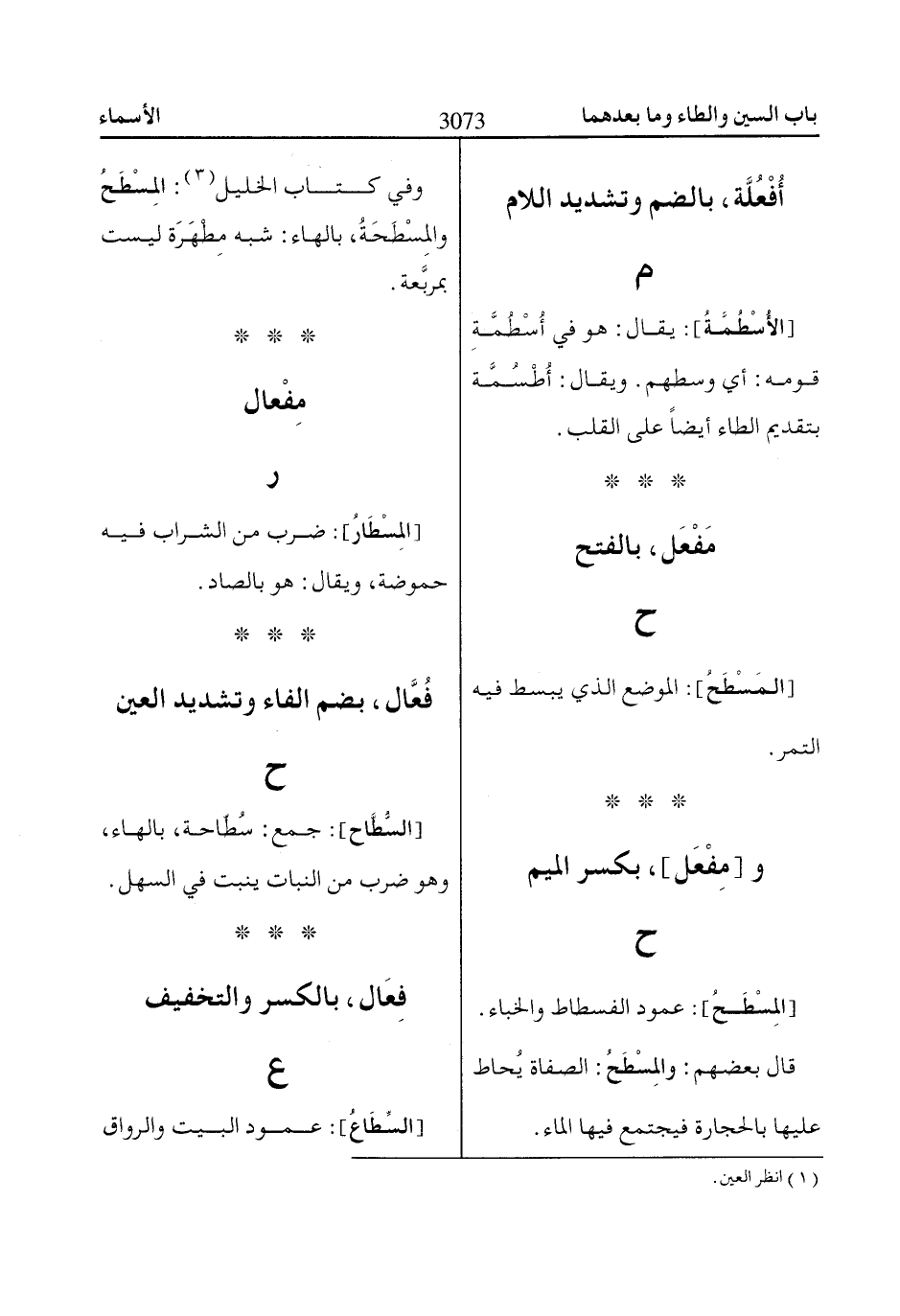 وفي كتاب الخليل «1»: المِسْطَحُ والمِسْطَحَةُ، بالهاء: شبه مِطْهَرَة ليست بمربَّعة.