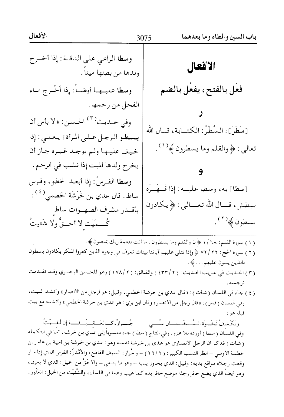 [سَطَرَ]: السَّطْرُ: الكتابة، قال اللّاه تعالى: وَالْقَلَمِ وَماا يَسْطُرُونَ «1».