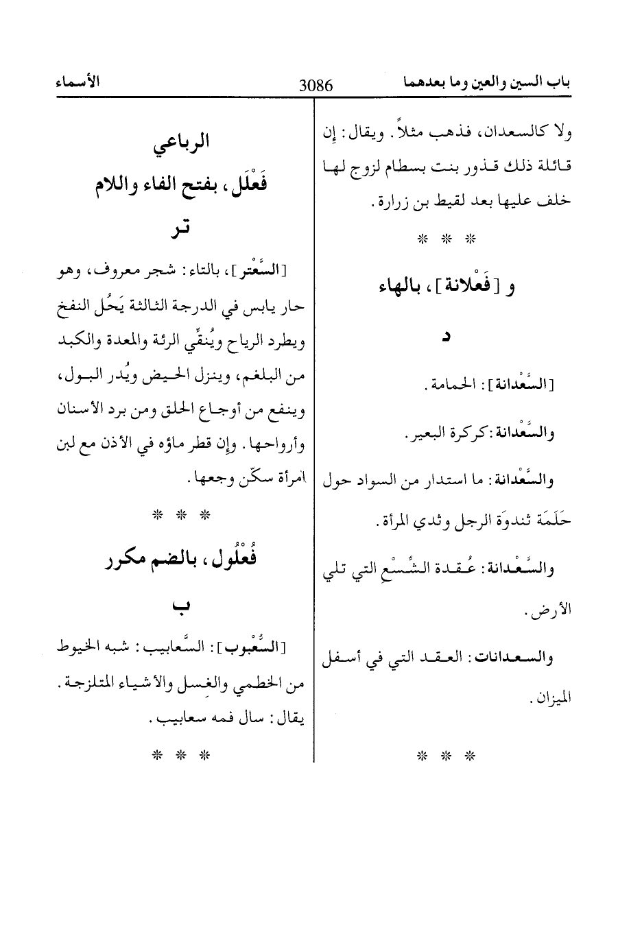 [السَّعْتر]، بالتاء: شجر معروف، وهو حار يابس في الدرجة الثالثة يَحُل النفخ ويطرد الرياح ويُنقِّي الرئة والمعدة والكبد من البلغم، وينزل الحيض ويُدر البول، وينفع من أوجاع الحلق ومن برد الأسنان وأرواحها. وإِن قطر ماؤه في الأذن مع لبن امرأة سكّن وجعها.