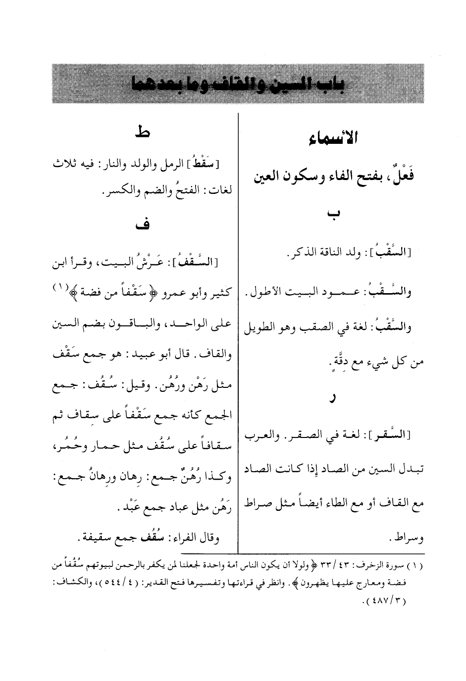 [السَّقْفُ]: عَرْشُ البيت، وقرأ ابن كثير وأبو عمرو سَقْفاً مِنْ فِضَّةٍ «1» على الواحد، والباقون بضم السين والقاف. قال أبو عبيد: هو جمع سَقْف مثل رَهْن ورُهُن. وقيل: سُقُف: جمع الجمع كأنه جمع سَقْفاً على سِقاف ثم سقافاً على سُقُف مثل حمار وحُمُر، وكذا رُهُنٌ جمع: رِهان ورِهانُ جمع: